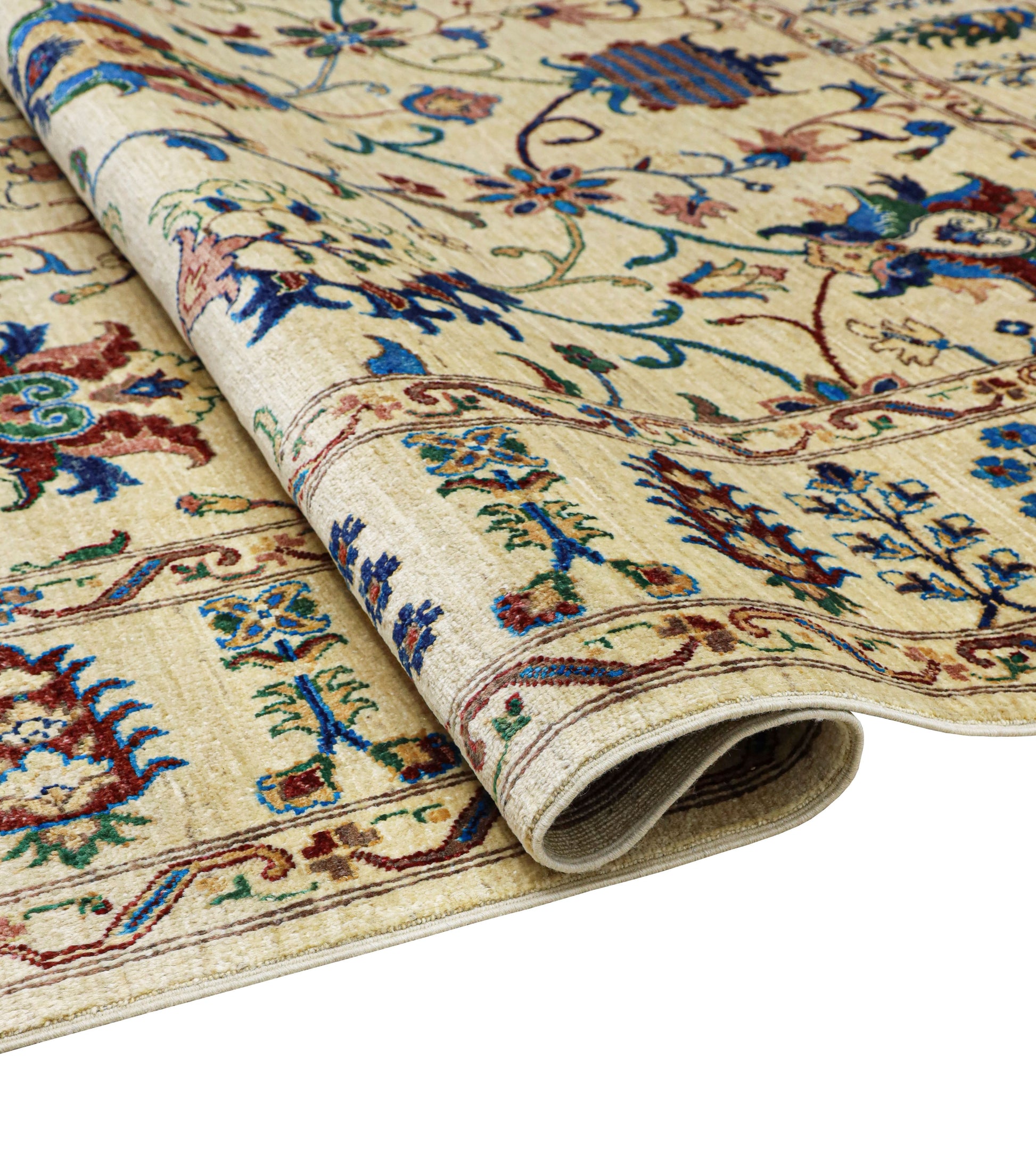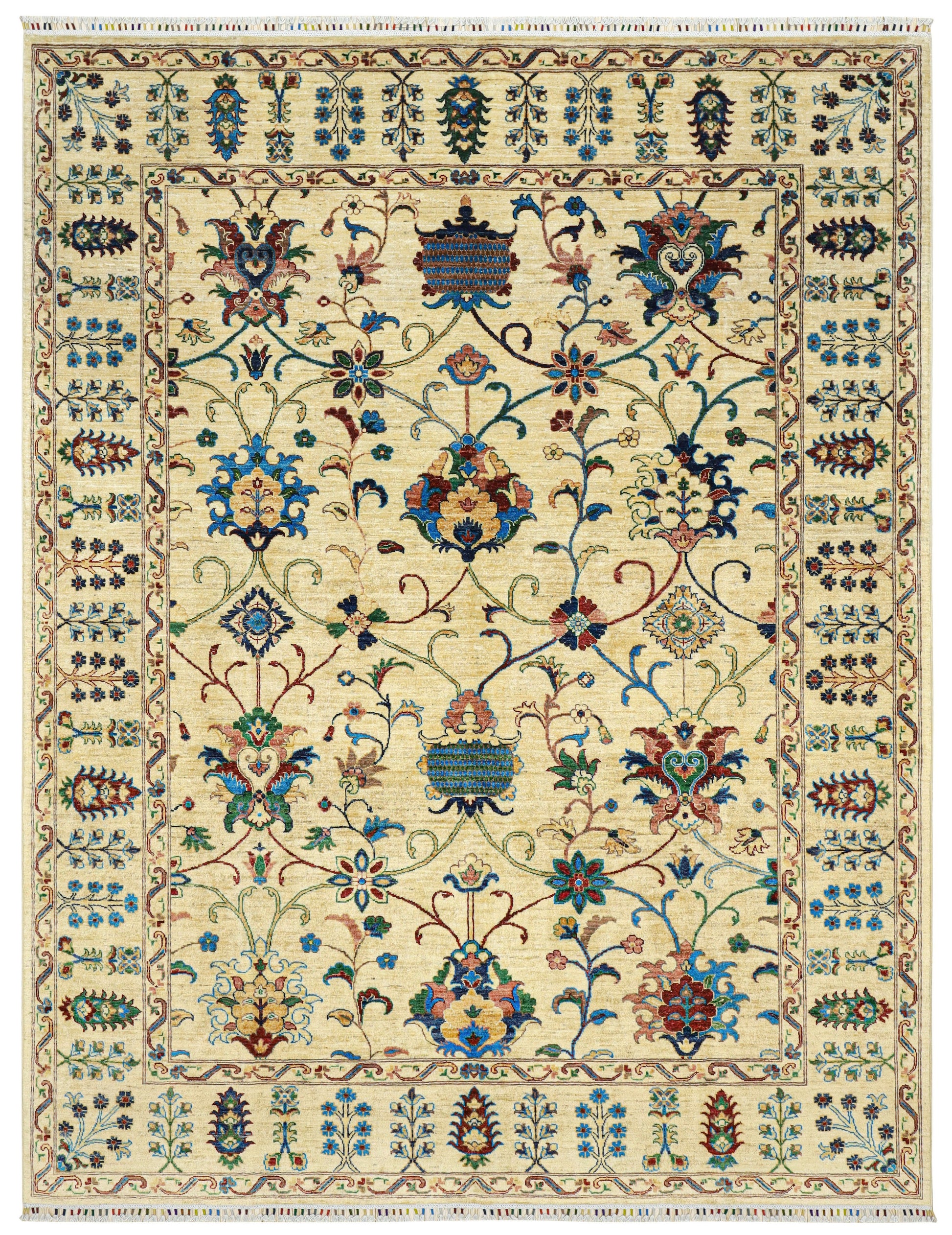 The Amiri design is a breathtaking fusion of classic Persian and Afghan influences, featuring an elaborate arrangement of floral patterns, delicate vines, and geometric accents. Its refined border frames the composition beautifully, while the sophisticated color palette—achieved through natural vegetable dyes—creates an elegant, well-balanced aesthetic. Whether placed in a modern or traditional setting, this rug effortlessly elevates the ambiance of any space.